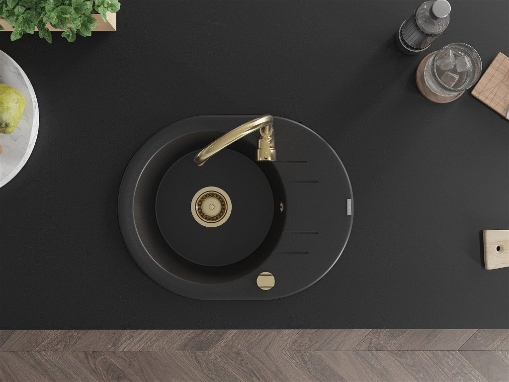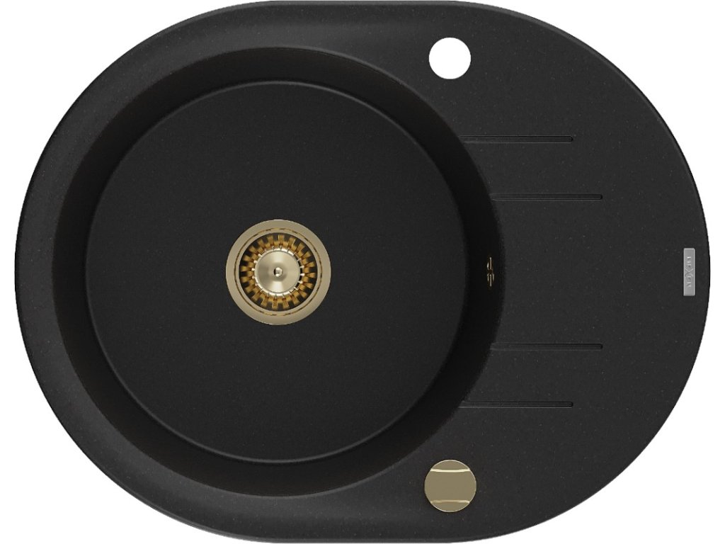MEXEN/S - Kevin granitový dřez 1 s odkapávačem 586x458 mm, černá, + zlatý sifon 6517581005-77-G