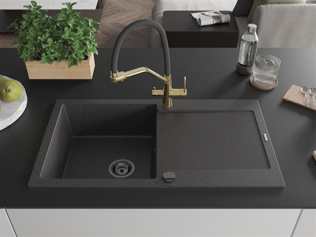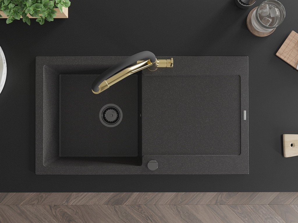 MEXEN/S - Leo granitový dřez 1-miska s odkapávačem včetně baterie Duo, černá kropenatá 6501-76-671701-57-B
