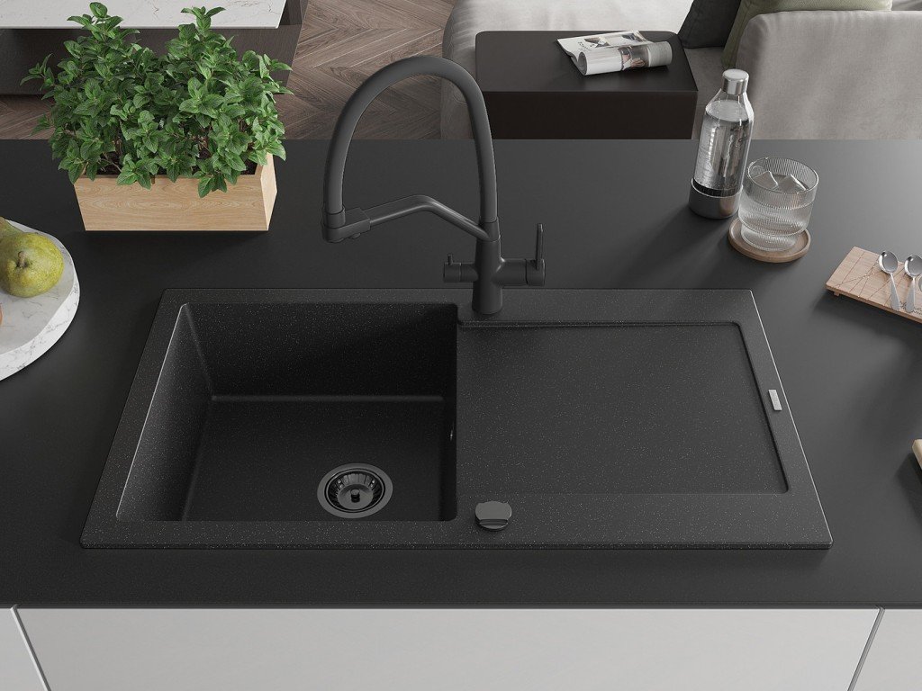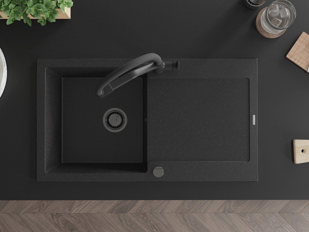 MEXEN/S - Leo granitový dřez 1-miska s odkapávačem včetně baterie Duo, černá/stříbrná metalik 6501-73-671701-70-B