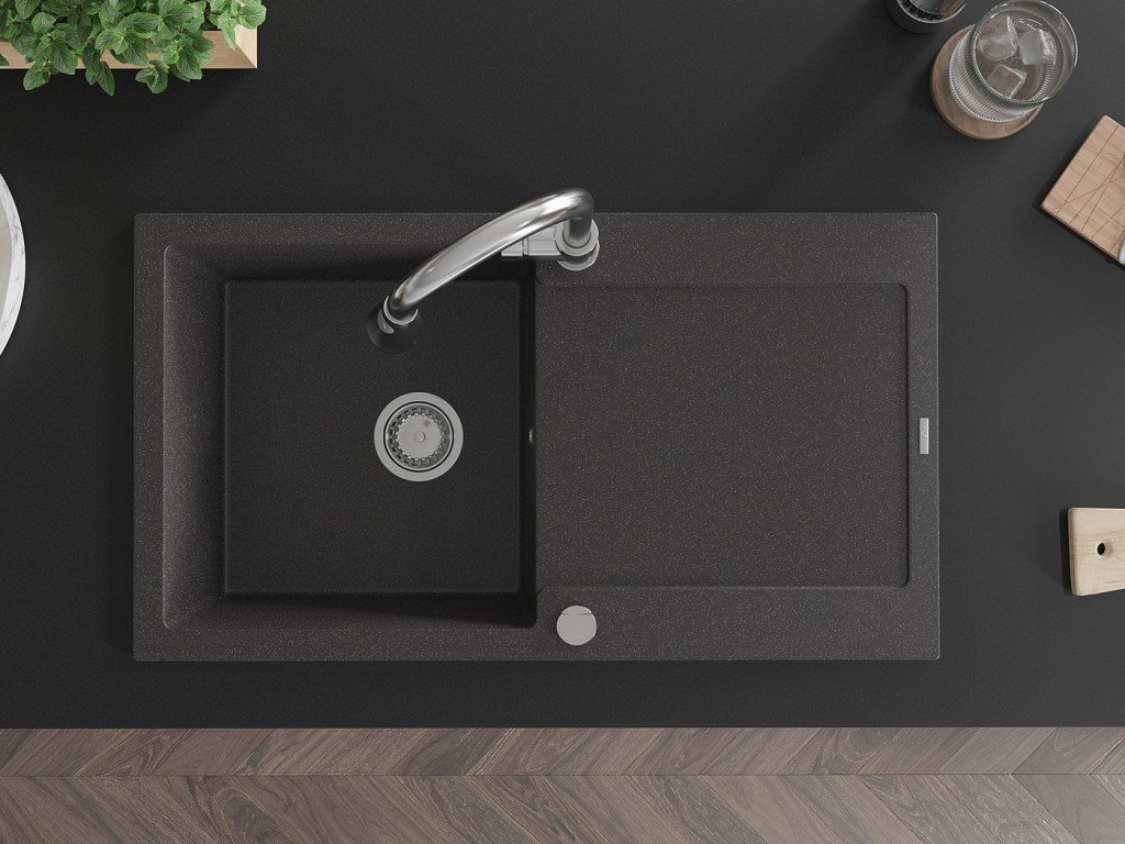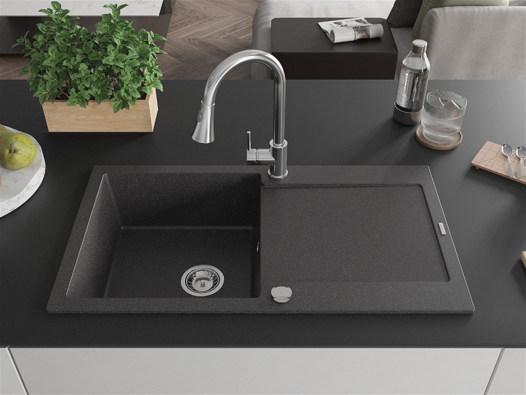 MEXEN/S - Leo granitový dřez 1-miska s odkapávačem včetně baterie Elia, černá kropenatá 6501-76-670101-00