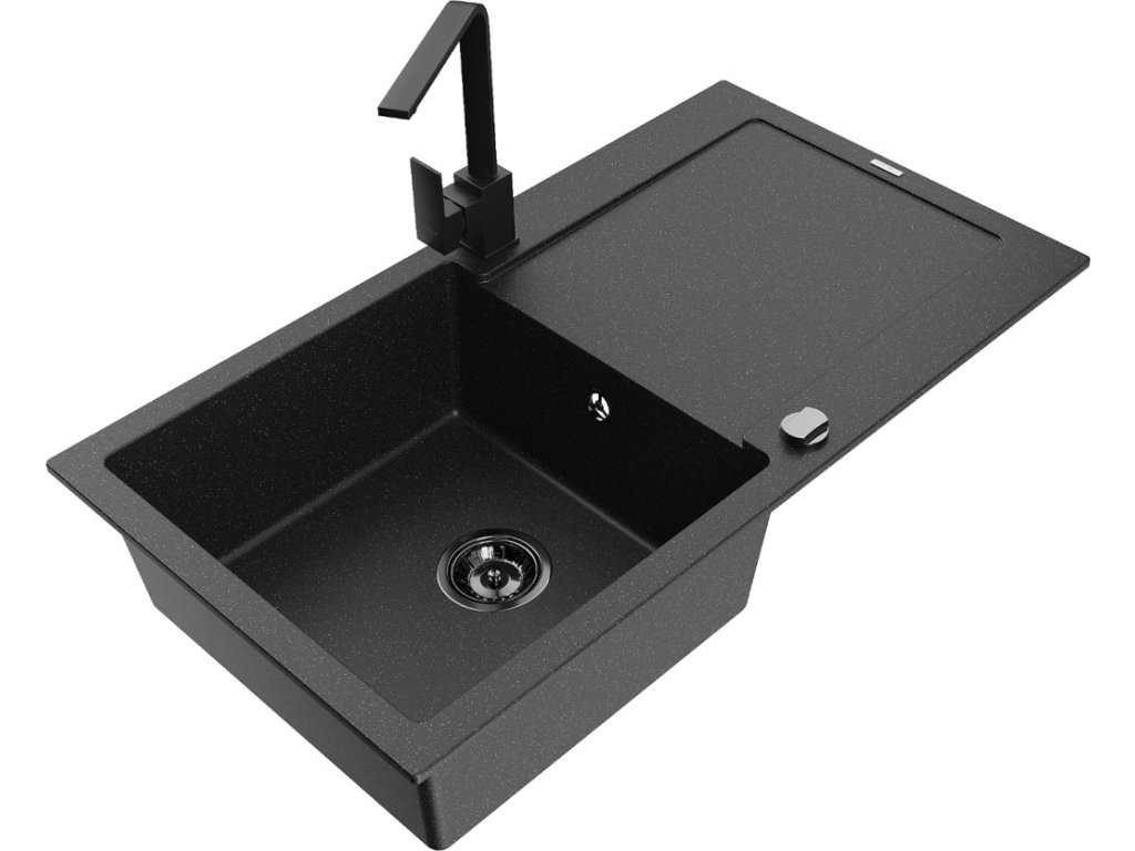 MEXEN/S - Leo granitový dřez 1-miska s odkapávačem včetně baterie Rita, černý/stříbrný metalik 6501-73-670300-70-B