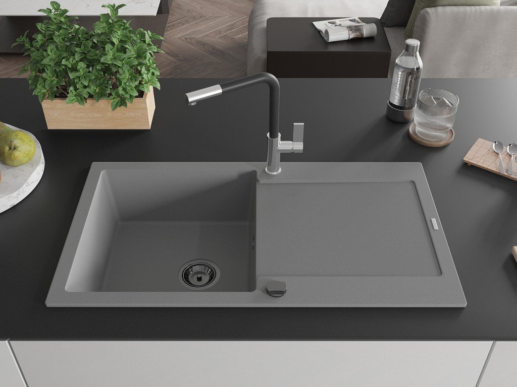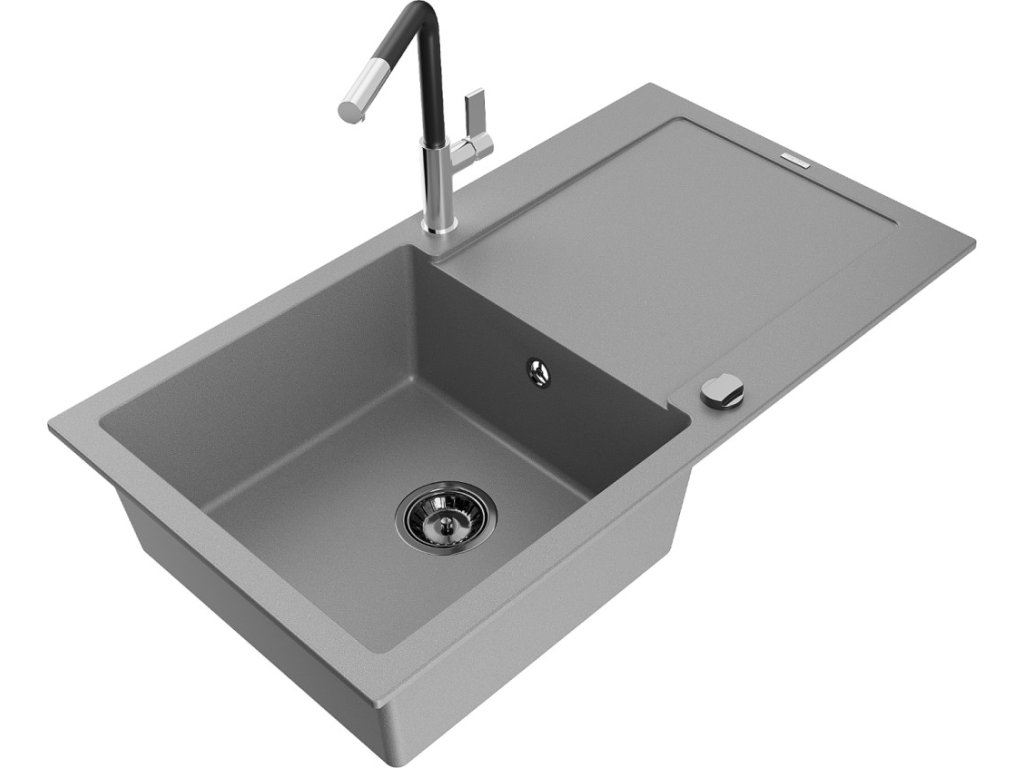 MEXEN/S - Leo granitový dřez 1 s odkapávačem včetně baterie Flora, šedá 6501-71-670401-07-B