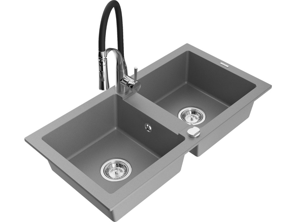 MEXEN/S - Mario granitový dřez 2-bowl včetně baterie Aster, šedá 6504-71-73450-07