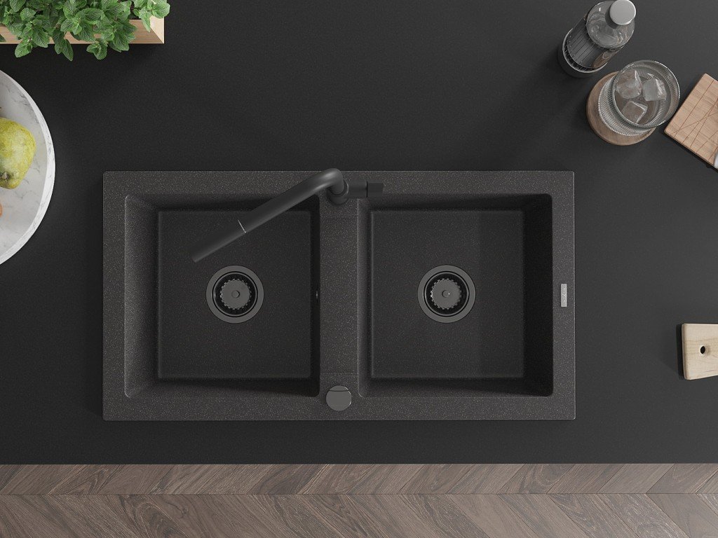 MEXEN/S - Mario granitový dřez 2-bowl včetně baterie Flora, černá kropenatá 6504-76-670401-70-B