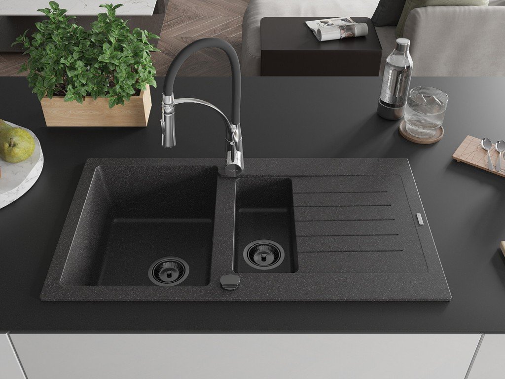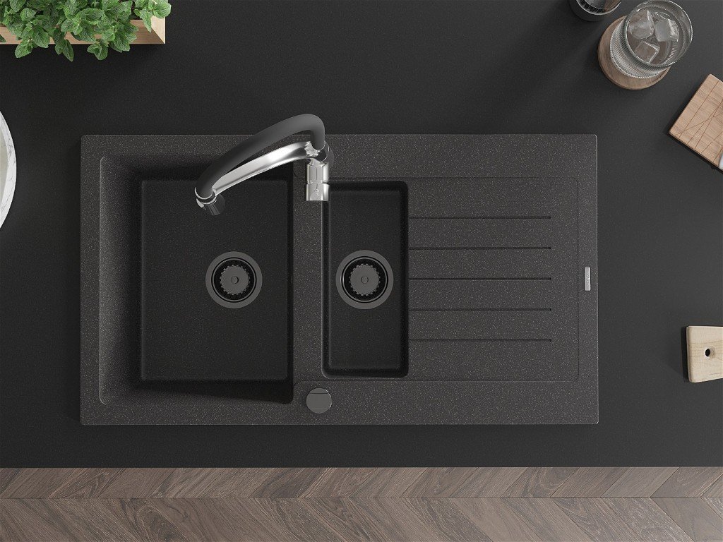 MEXEN/S - Matias granitový dřez 1.5 s odkapávačem včetně baterie Aster, černá kropenatá 6502-76-73450-07-B