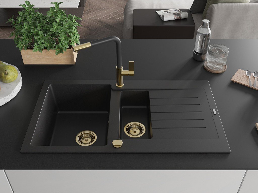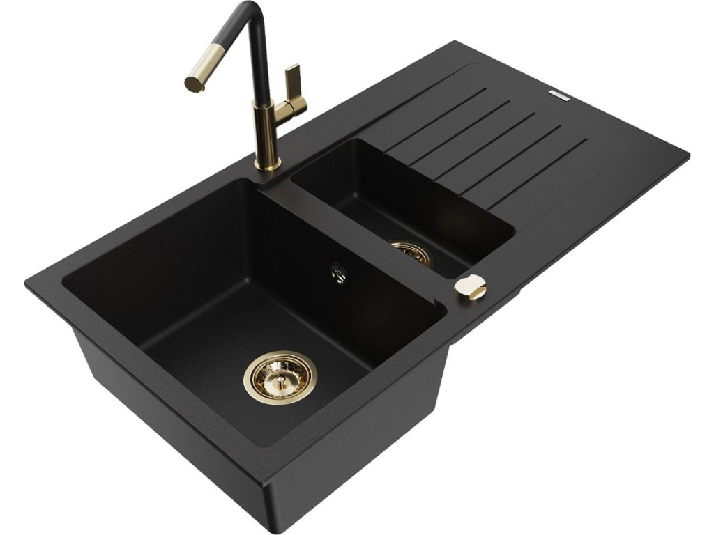 MEXEN/S - Matias granitový dřez 1.5 s odkapávačem včetně baterie Flora, černá 6502-77-670401-57-G DOPRAVA ZDARMA