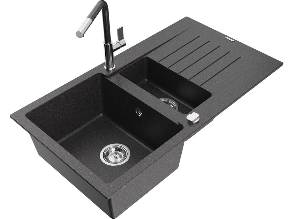 MEXEN/S - Matias granitový dřez 1.5 s odkapávačem včetně baterie Flora, černá kropenatá 6502-76-670401-08