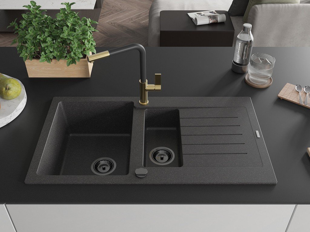 MEXEN/S - Matias granitový dřez 1.5 s odkapávačem včetně baterie Flora, černá kropenatá 6502-76-670401-57-B DOPRAVA ZDARMA