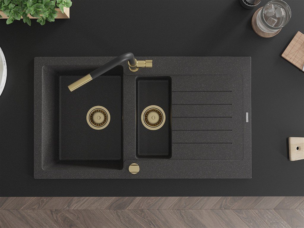 MEXEN/S - Matias granitový dřez 1.5 s odkapávačem včetně baterie Flora, černá kropenatá 6502-76-670401-57-G DOPRAVA ZDARMA