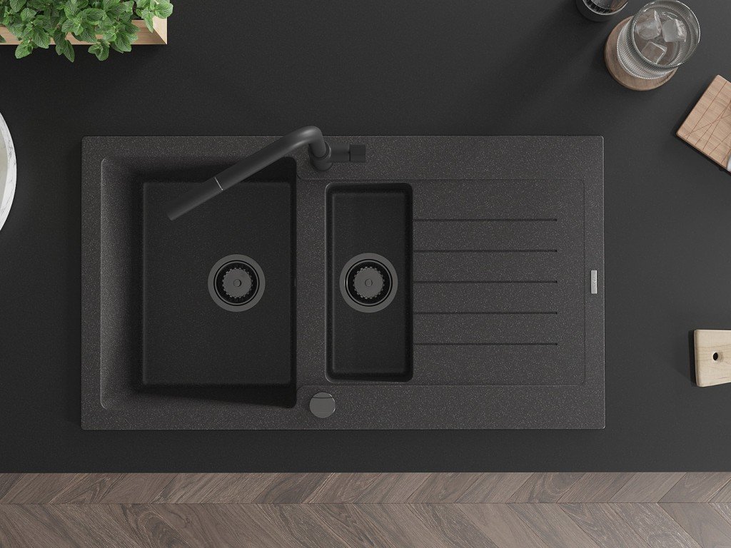 MEXEN/S - Matias granitový dřez 1.5 s odkapávačem včetně baterie Flora, černá kropenatá 6502-76-670401-70-B