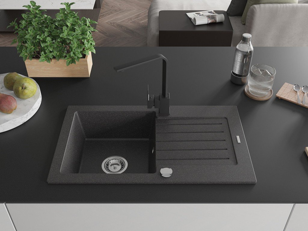 MEXEN/S - Pablo granitový dřez 1-miska s odkapávačem včetně baterie Rita, černý kropenatý 6510-76-670300-70