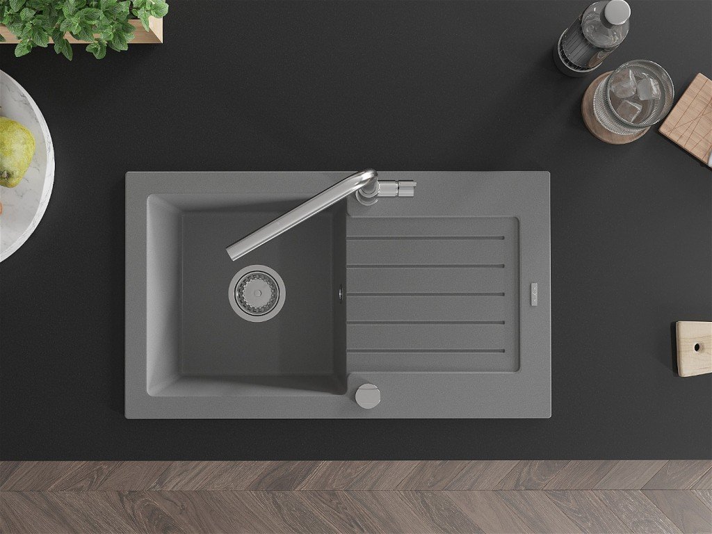 MEXEN/S - Pablo granitový dřez 1 s odkapávačem včetně baterie Flora, šedá 6510-71-670401-00