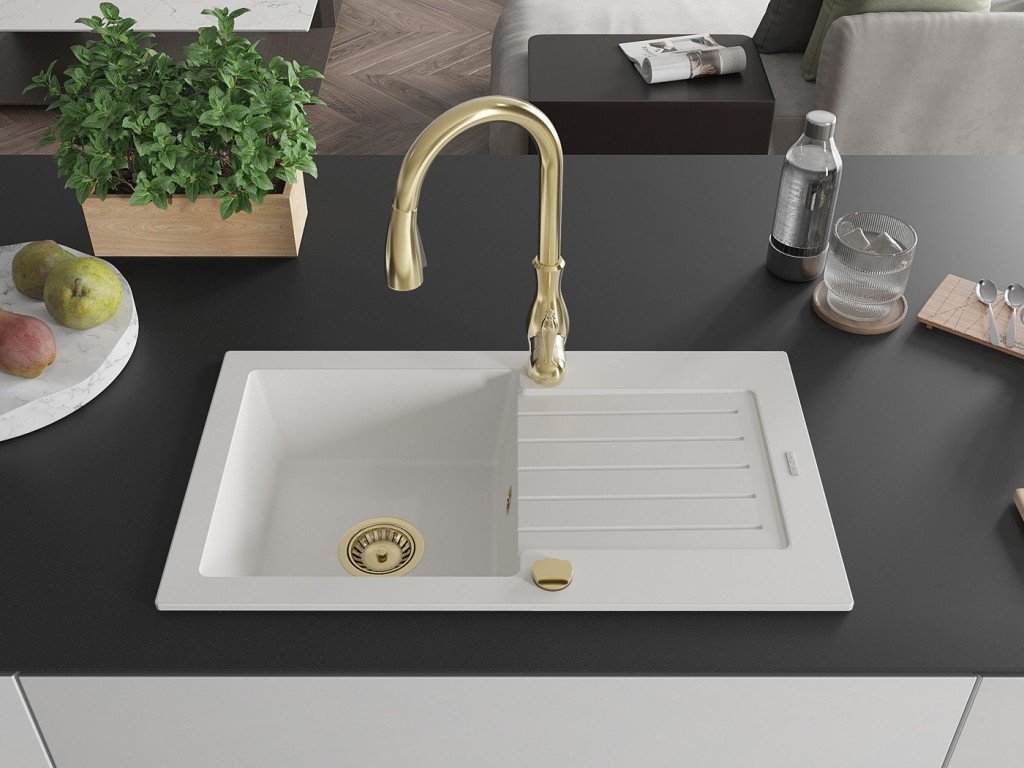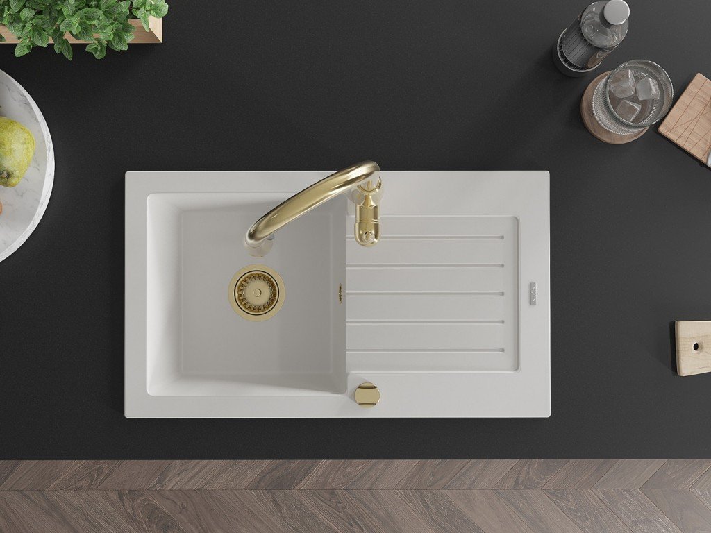 MEXEN/S - Pablo granitový dřez 1 s odkapávačem včetně baterie Savita, bílá 6510-20-672601-50