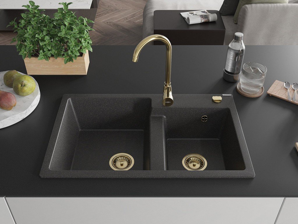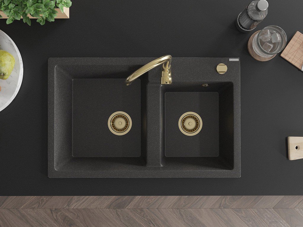 MEXEN/S - Tomas granitový dřez 2-bowl 800x500 mm, černá kropenatá, + zlatý sifon 6516802000-76-G