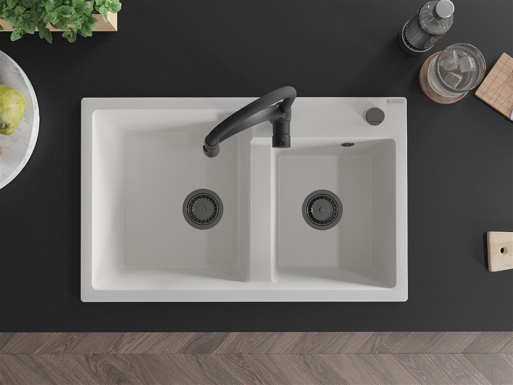 MEXEN/S - Tomas granitový dřez 2-bowl včetně baterie Aster, bílá 6516-20-73450-70-B