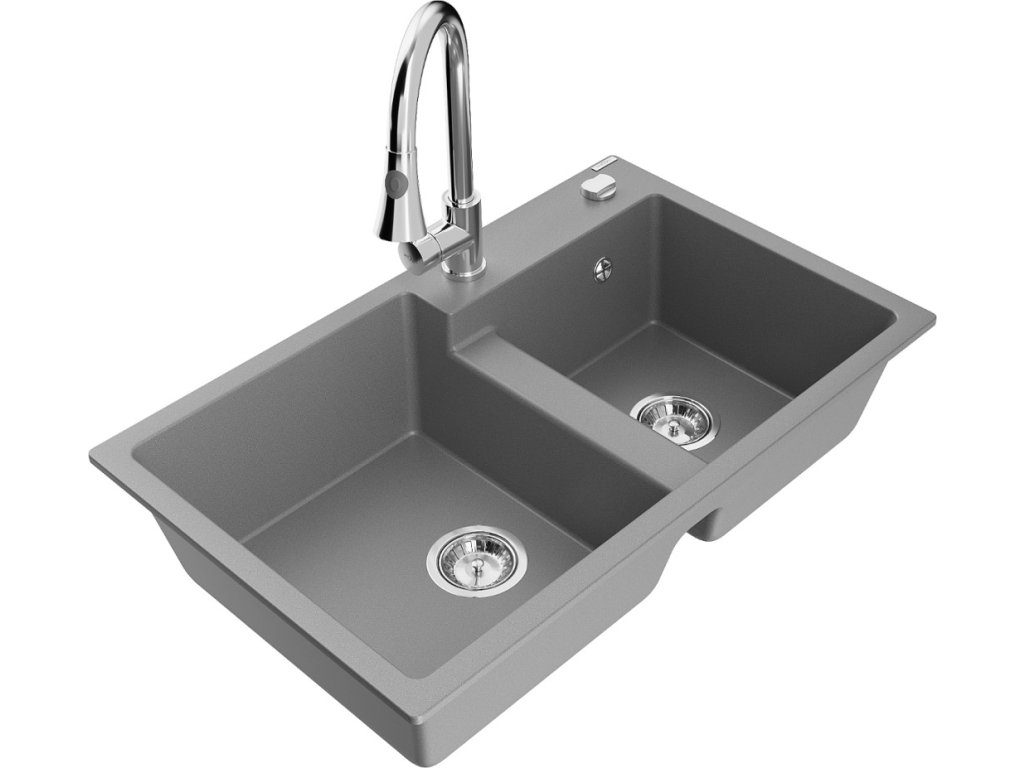 MEXEN/S - Tomas granitový dřez 2-bowl včetně baterie Elia, šedá 6516-71-670101-00