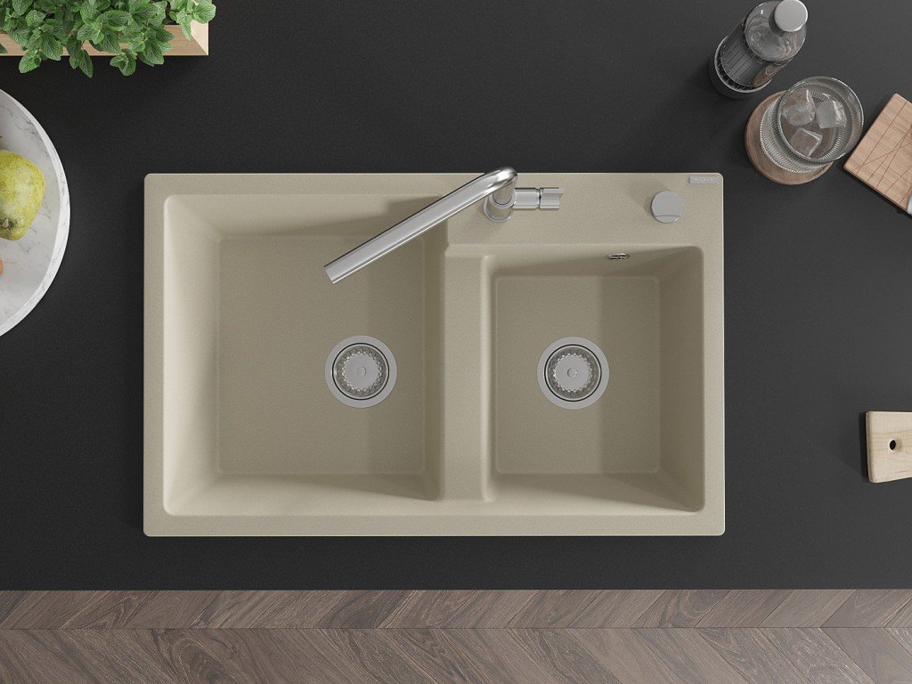 MEXEN/S - Tomas granitový dřez 2-bowl včetně baterie Flora, béžová 6516-69-670401-00