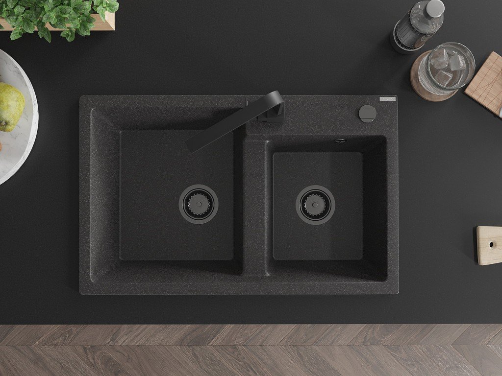 MEXEN/S - Tomas granitový dřez 2-bowl včetně baterie Rita, černá kropenatá 6516-76-670300-70-B