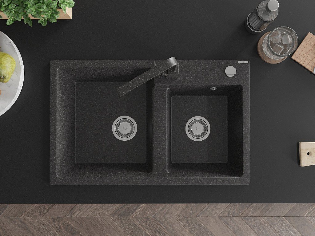 MEXEN/S - Tomas granitový dřez 2-bowl včetně baterie Rita, černá kropenatá 6516-76-670300-76