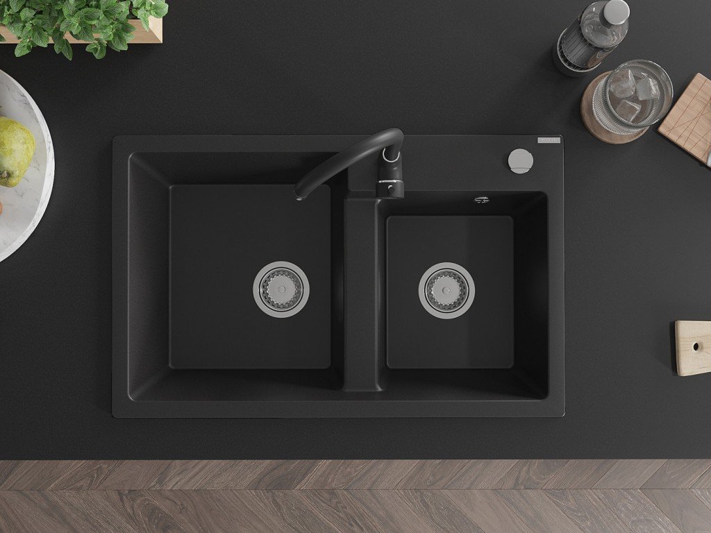 MEXEN/S - Tomas granitový dřez 2-bowl včetně baterie Telma, černá 6516-77-670200-70