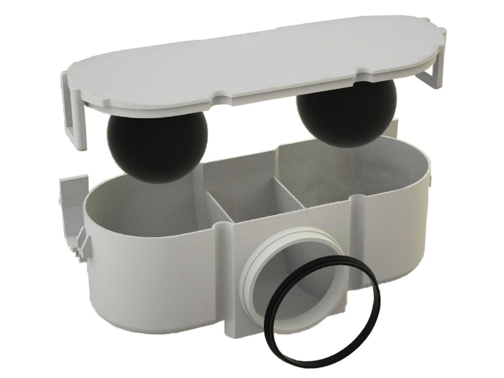 - Dvojitá zápachová uzávěra, vodní sloupec a kulička. Tzn. V případě odpaření vody (podlahové topení, nepoužívané byty atd.) kulička zaklapne otvor a zabraňuje vzlínání pachu