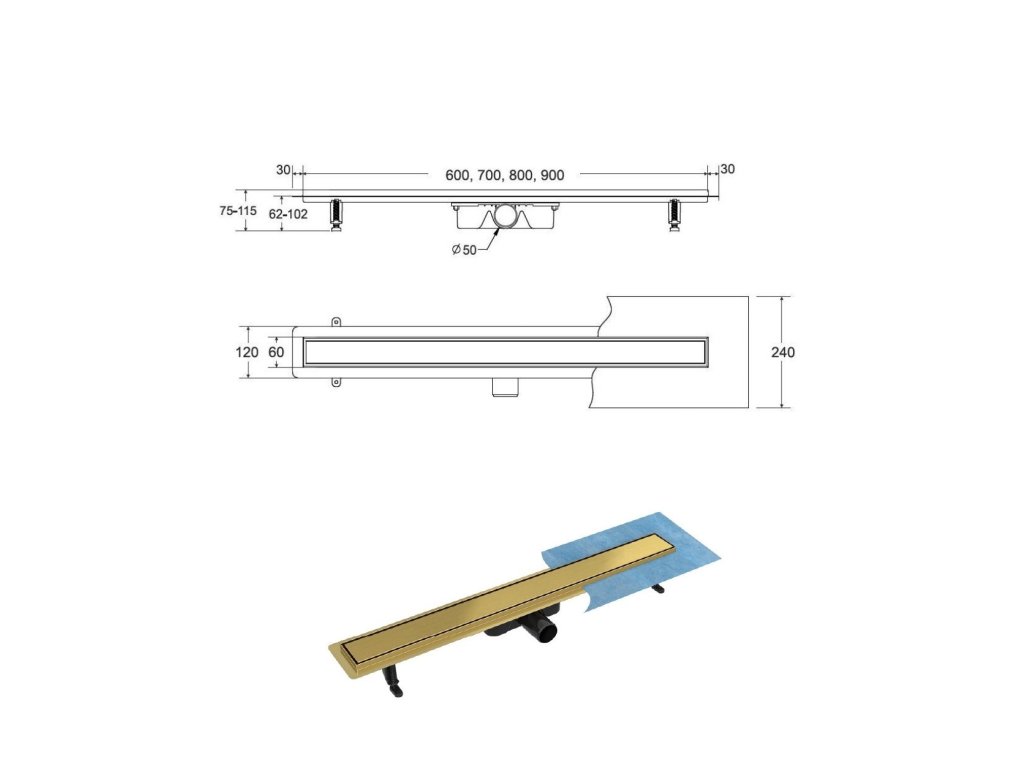 Kvalitně a moderně zpracovaný odtokový žlab. Tělo žlabu i vlastní rošt je vyroben z velice kvalitní nerezi a jsou oba s povrchovou úpravou ve zlaté broušené barvě. Rošt lze použít buď pro vložení dlažby, nebo jako pohledový (zlatá broušená barva). Tento žlab obohatí každou koupelnu o nádech luxusu. Sada obsahuje: žlab se sifonem a nožičkami, rošt a hydroizolační pásku.