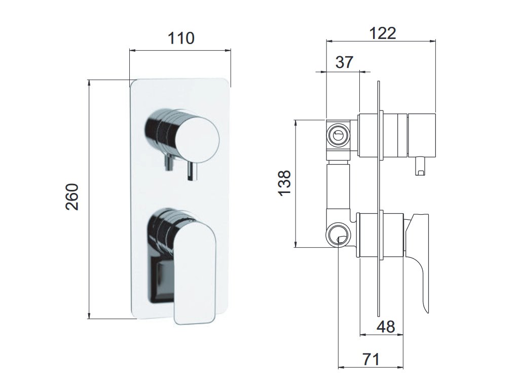 - Sprchová baterie podomítková, bez příslušenství, s přepínačem, 2 výstupy