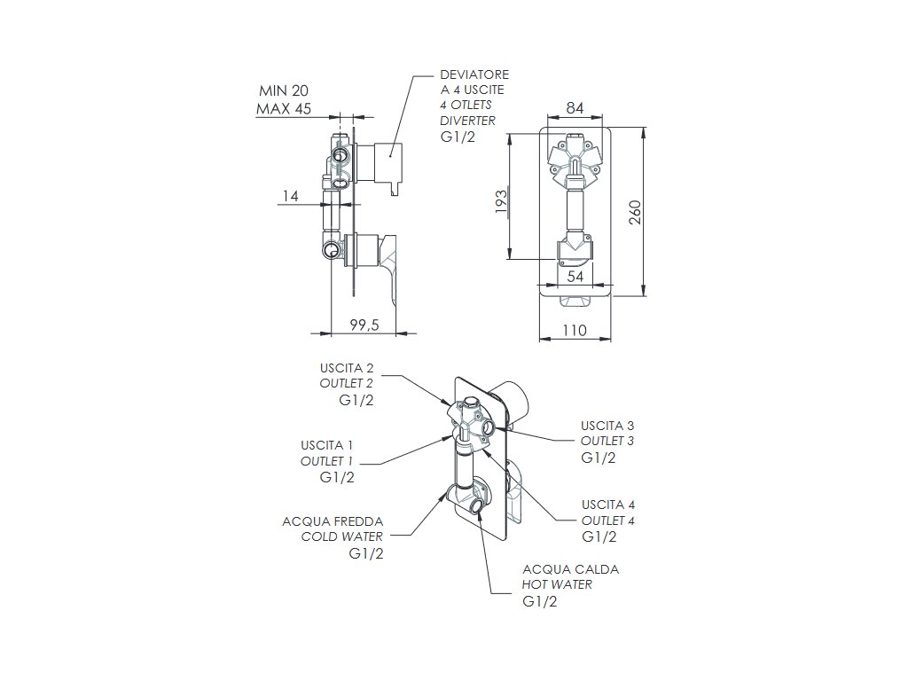 - Sprchová baterie podomítková, bez příslušenství, s přepínačem, 4 výstupy