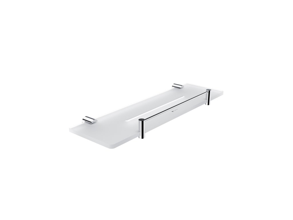 Police s frézovanými otvory. Materiál plexiglass s matným povrchem. Délka 40 cm. Úchyty mosaz/chrom.