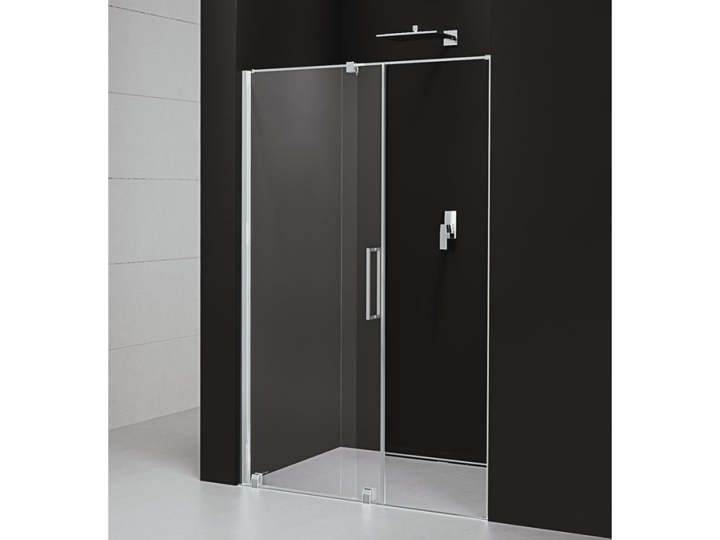 - Dvojdílné sprchové dveře do prostoru (pevná a posuvná část) s hliníkovými profily v chromu nebo matně černé povrchové úpravě