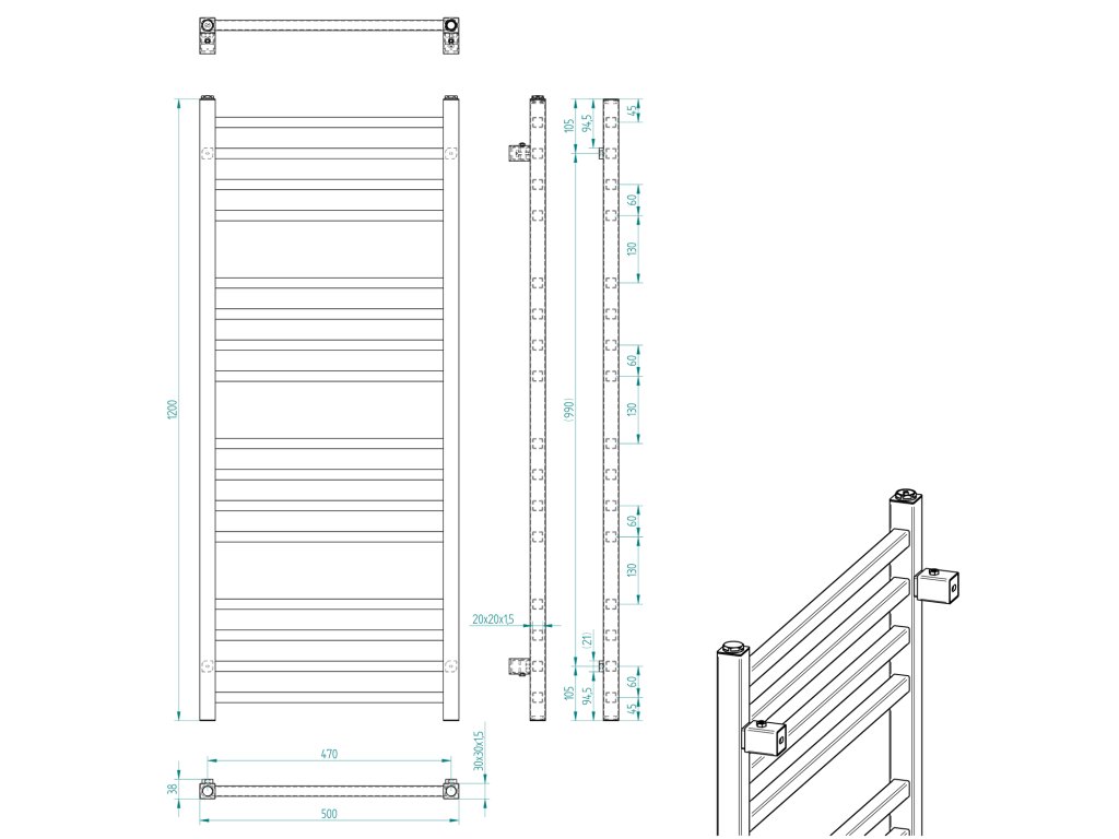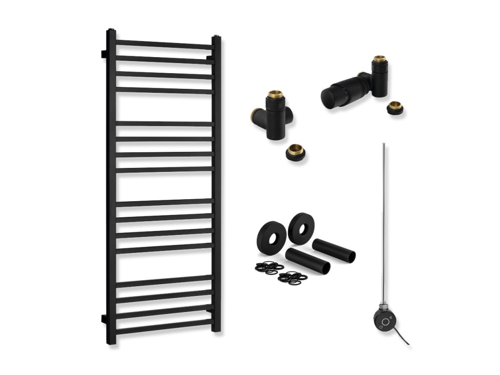 Tato kompletní sada pro koupelnu představuje praktické a designově sladěné řešení vytápění v oblíbeném provedení černá mat. Základem je žebříkové otopné těleso o rozměru 500 × 1200 mm, které nabízí optimální poměr mezi topným výkonem a prostorem pro sušení ručníků. Díky svým rozměrům je vhodné do většiny běžných koupelen v bytech i rodinných domech.