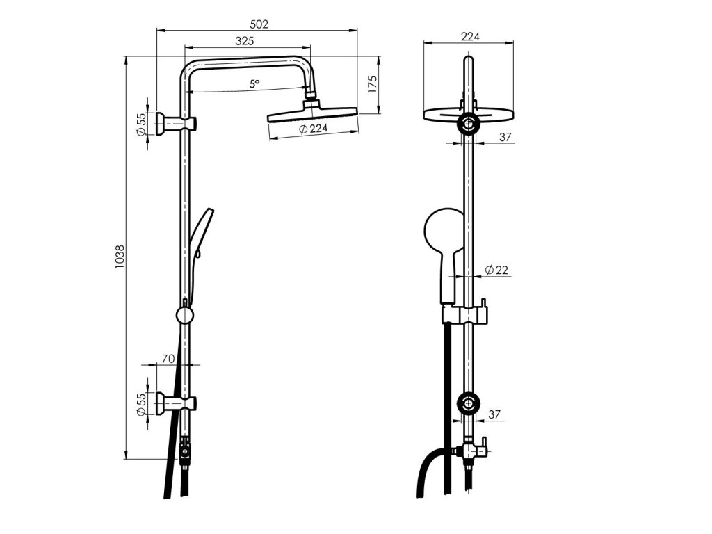 - Úchyty na zeď, polička, hadice (pro připojení setu 80 cm, pro připojení ruční sprchy 150 cm)