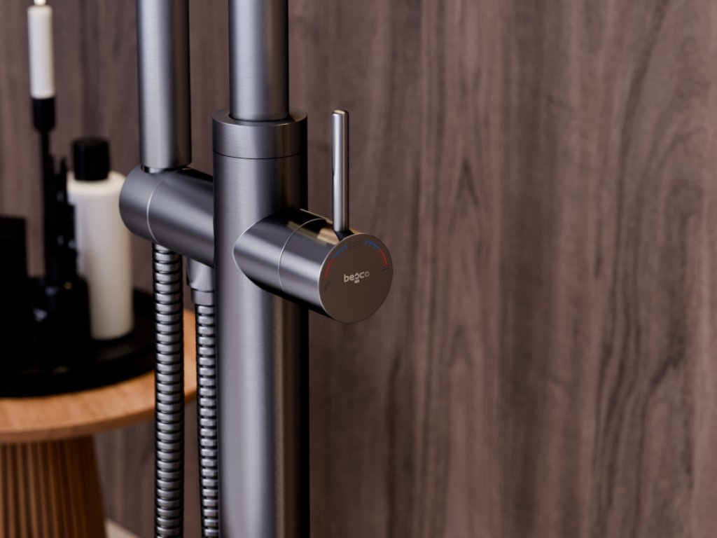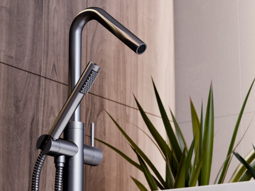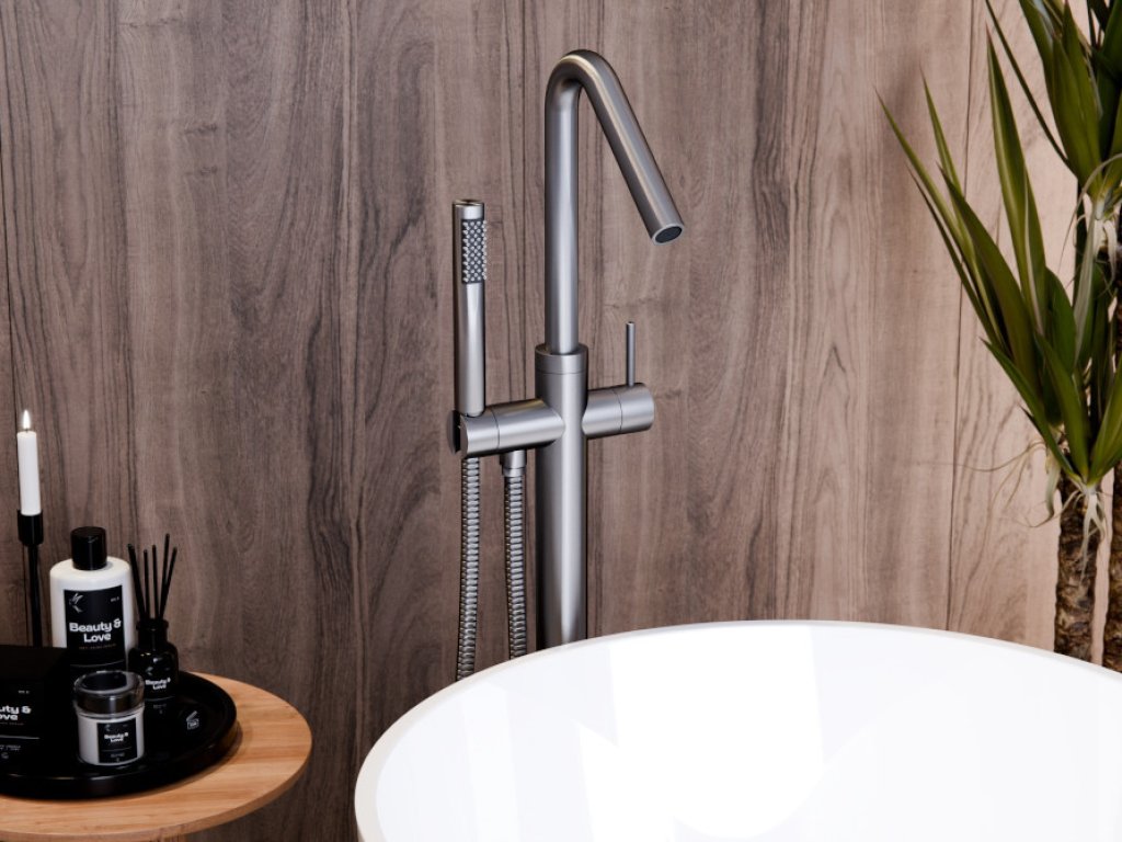 Stojánková baterie do podlahy vypadá skvěle v kombinaci s volně stojící vanou.