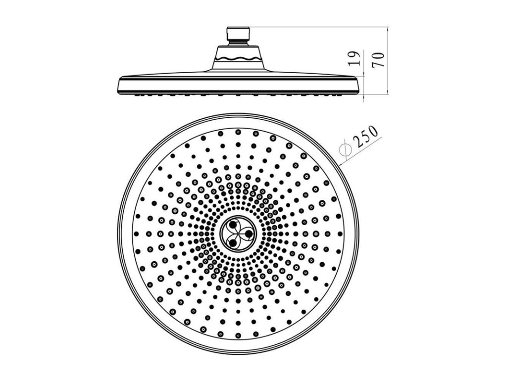 Talířová hlavová sprcha o rozměru ø 250 mm se vyznačuje moderním designem, vysokou variabilitou a především umožňuje téměř libovolnou kombinaci s příslušenstvím sprchového programu. Má velmi jemný proud vody. Součástí je také výkyvný kloub.Funkce sprchy:
