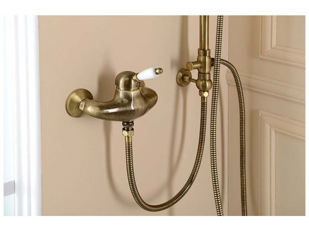 Nástěnná sprchová baterie v retro stylu s černou keramickou pákou a stylovým bronzovým povrchem. Standardní rozteč uchycení 15 cm.