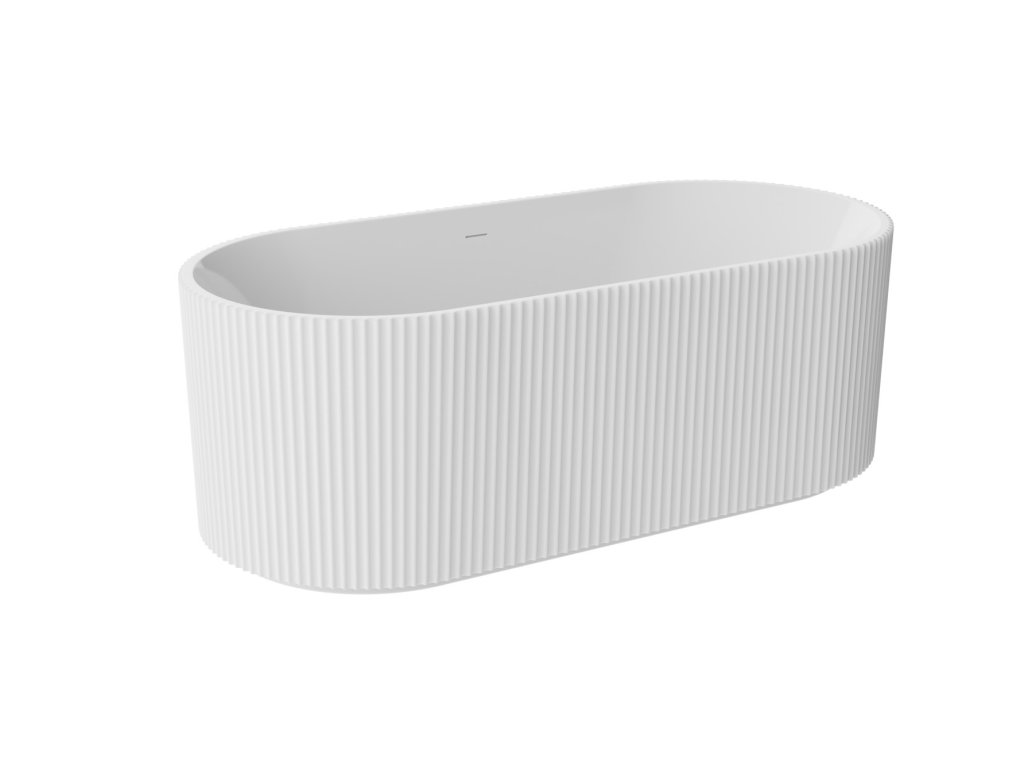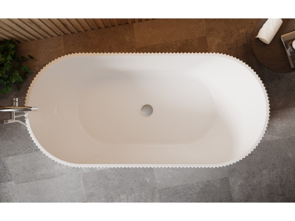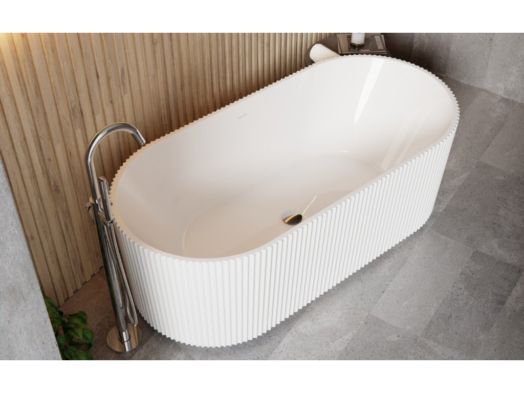 Asymetrická volně stojící vana LEAY s velmi originální vroubkovaným čelním panelem, která je určena pro instalaci k průběžné zdi v dvou praktických rozměrech, robustní...