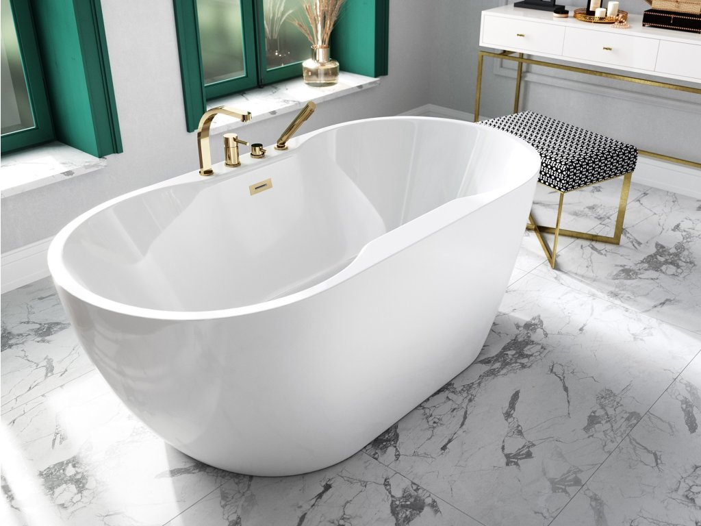 Symetricky oválná volně stojící retro vana OLAYA Glam se vyrábí s kovovými ozdobnými nohami ve čtyřech barevných variantách (chrom, černá, bílá a zlatá barva). Krásná masivní...