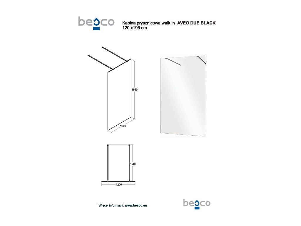 Walk-in sprchový kout AVEO DUE BLACK, 120, 195, Čiré bezpečnostní sklo - 8 mm, Bez pevné stěny, Černá