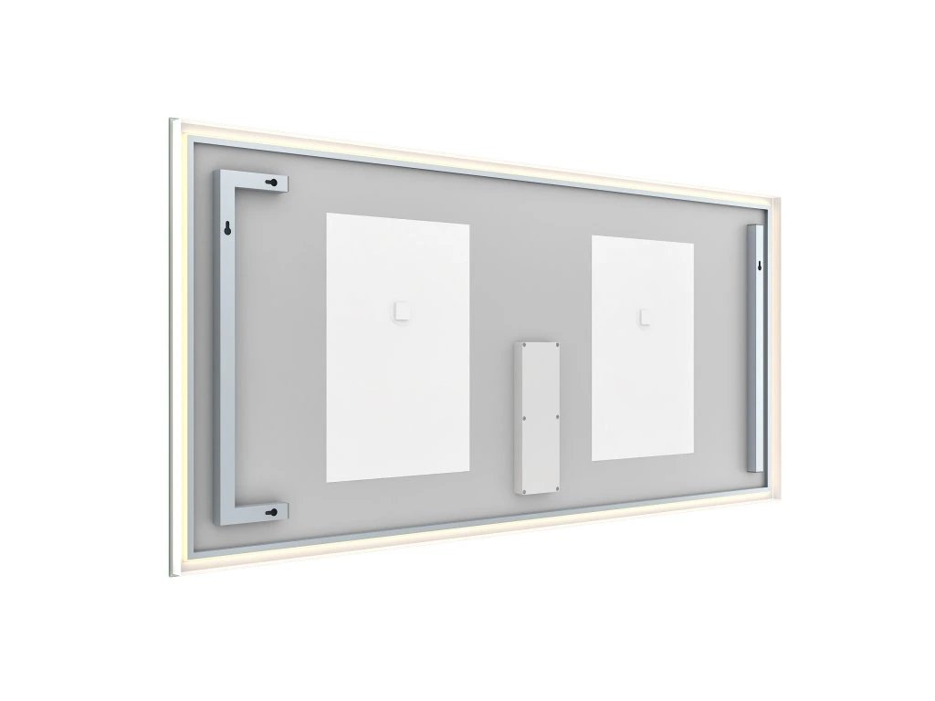 - Jednoduchá instalace: Zrcadlo má na zadní straně hliníkový rám s připravenými otvory pro montáž na zeď, šrouby i hmoždinky jsou součástí balení. Rám je vzdálen 2,5 cm od okraje, což zachovává design zrcadla a není viditelný z bočních úhlů; zároveň zajišťuje účinné chlazení napájecího trafa.