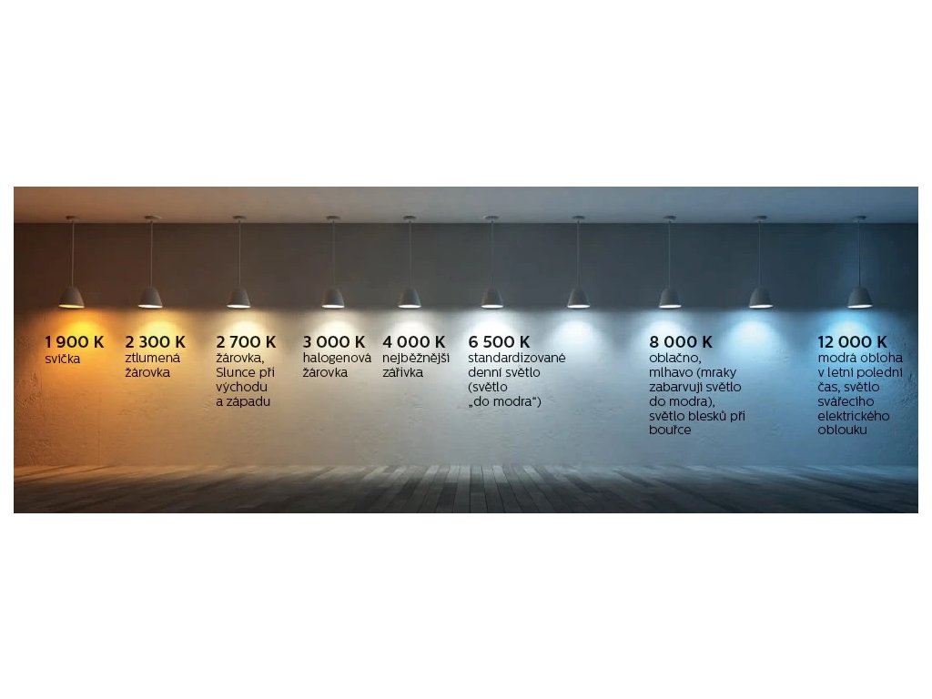 - Nastavitelná teplota barvy osvětlení: 2700 K až 6500 K, viz. tabulka v galerii